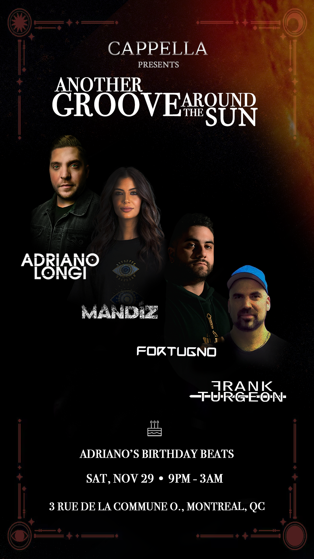 Join us under the stones and in the heart of Montreal’s Old Port at Cappella to celebrate another groove around the sun with a night built around rhythm, energy, and connection to celebrate Adriano’s birthday with very special guests, at a very special place.