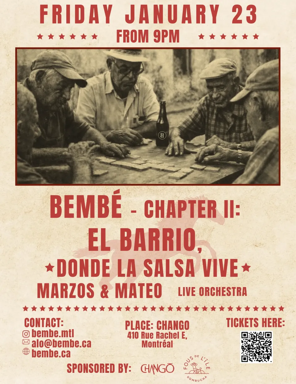 BEMBÉ — Chapitre 2 : El Barrio, donde la salsa vive.Bembé revient avec son deuxième chapitre, une soirée dédiée aux racines, aux rues et à l'énergie du quartier où la salsa est née. Un rassemblement pour danser, créer des liens et ressentir la musique qui vient du cœur. Ce 23 janvier, à partir de 21 h, la soirée s'anime avec Marzos & Mateo — orchestre en direct, rejoint par DJ Paf, qui réchauffera la piste de danse dès le petit matin. Lieu : Chango MTL - 410 Rue Rachel, MontréalUne expérience où la salsa est vécue, appréciée et respectée. Le quartier ne s'explique pas... C'est dansé. Nous regardons J'ai hâte de continuer à écrire cette histoire ensembé.familia Bembé ✨