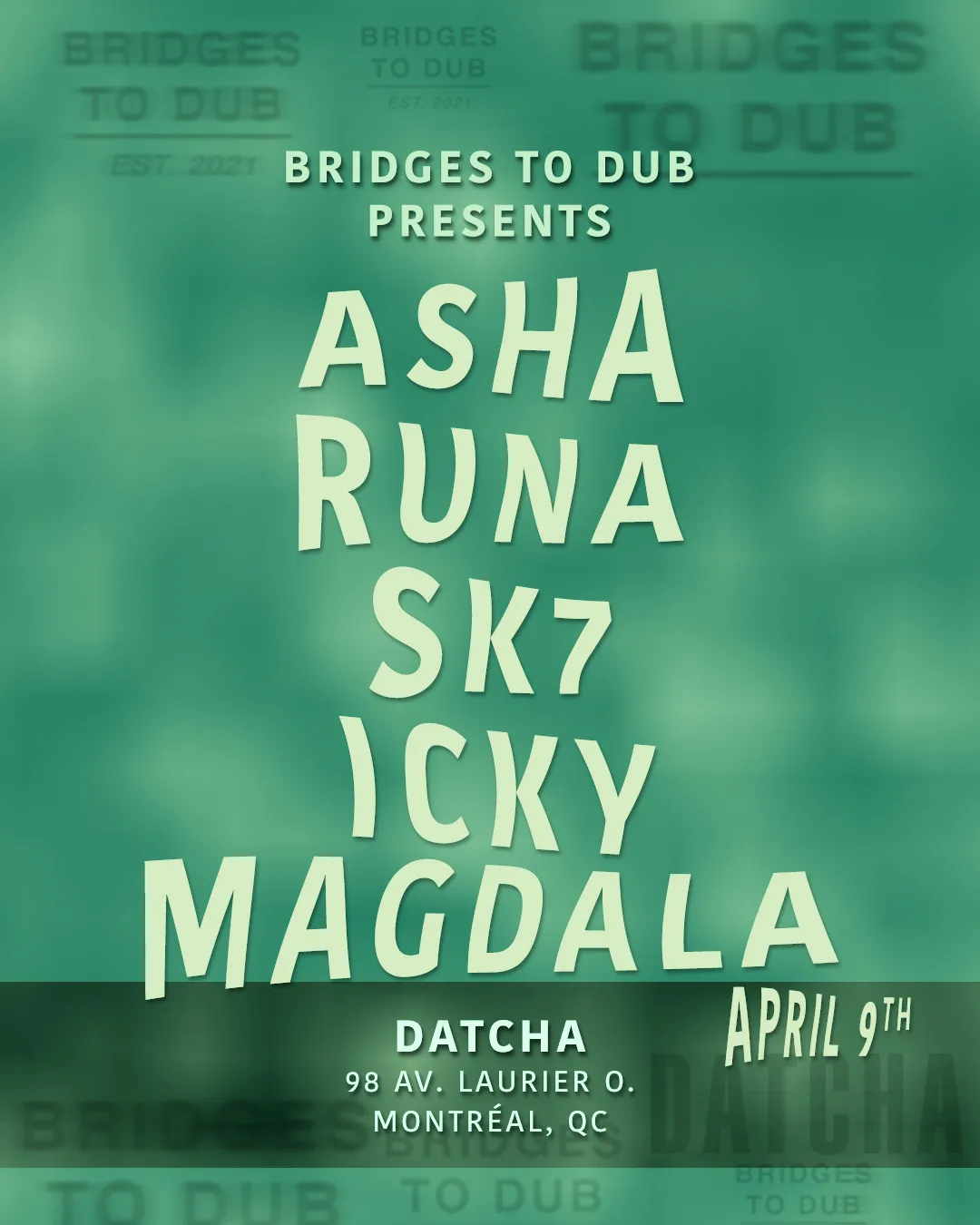 ✨ 9 avril 2026 ✨ Bridges to Dub -> DatchaBridges to Dub présente le dub et ses sous-genres depuis 5 ans, tout en établissant des liens solides au sein de la scène. À travers son émission de radio en ligne et ses événements organisés, la plateforme continue de mettre en avant des artistes et de rassembler la communauté.— 📍 Le point de rencontre est à Datcha ce 9 avril pour une soirée dédiée à des sélections approfondies et à un son piloté par le doublage, avec : - ASHA- RUNA- SK7- ICKY Magdala : le meilleur choix de la soirée ! Arrivez tôt, restez tard !