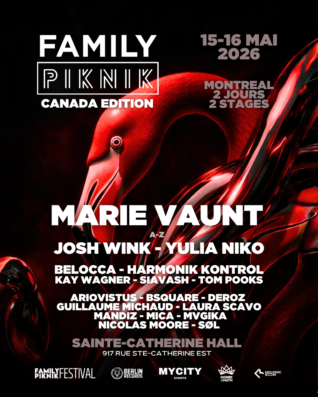 Family Piknik débarque à Montréal pour une édition spéciale canadienne les 15 et 16 mai 2026 à la salle Sainte-Catherine. Pendant 2 jours et sur 2 scènes, découvrez l'univers unique de Family Piknik où techno et house se rencontrent dans un cadre immersif et plein d'énergie. Cette édition mettra en vedette une programmation internationale et locale exceptionnelle, dont Marie Vaunt, Josh Wink, Yulia Niko, Harmonik Kontrol (Live), Belocca, Kay Wagner, Siavash, Tom Pooks et bien d'autres. Conçu pour les amateurs de musique électronique, l'événement offre une atmosphère intense, élégante et festive au cœur de Montréal. Que vous aimiez les groove deep house ou les sons techno puissants, cette édition promet un voyage sonore mémorable dans l'une des salles emblématiques de la ville.