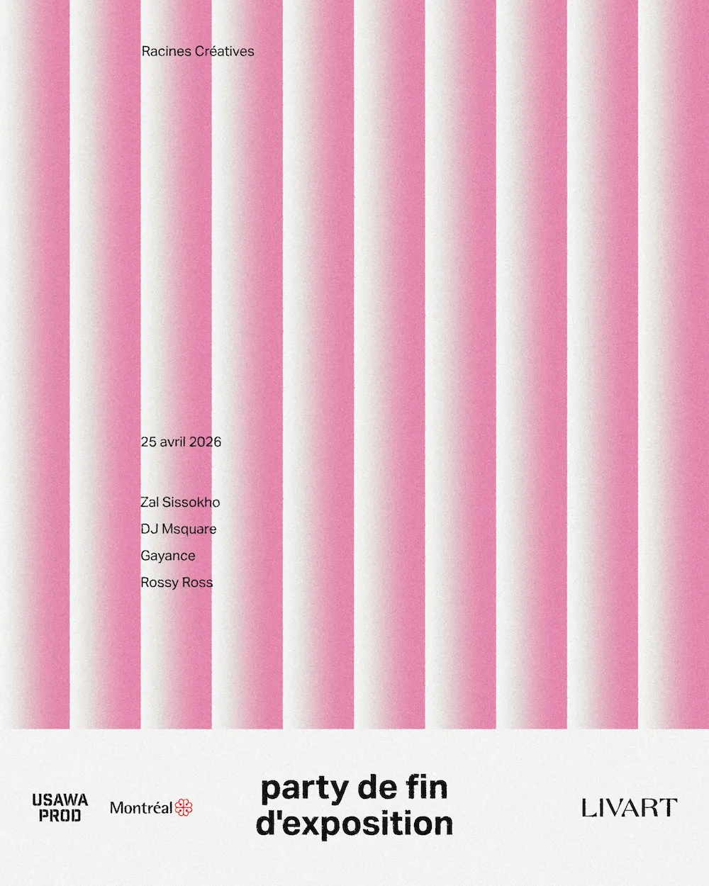 PARTY DE FIN D’EXPOSITIONSamedi 25 avril21h00 - 6h00À l’occasion du dernier week-end de l’exposition « Racines créatives », nous organisons une soirée de finissage festive et immersive pour finir ça en grand!PSSST! Le Livart a un bar sur place et a obtenu un permis d’alcool jusqu’à 6h du matin!AU PROGRAMME :21h00 à 23h00 : Galerie ouverte au public pour visiter l’exposition en version nocturne21h45 à 22h30 : Spectacle de kora par Zal Sissokho (@zalsissokho)Après on descend dans la grande salle pour faire le party jusqu’aux petites heures du matin!23h à 1h : Afrobeat/electro/trap/Konpa: DJ Msquare (@deejaymsquare)1h à 4h : Afrohouse/électro: Gayance (@gayance)4h à 6h : Afrohouse: Rossy Ross (@rossyross_ondamix)La soirée est réalisé en collaboration avec Production Usawa (@usawa__ ). Le Livart remercie la Ville de Montréal (@mtl_ville ) pour son soutien.